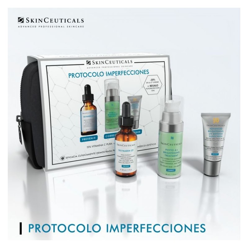Recobra una piel limpia, fresca y sin imperfecciones descubre el protocolo diseñado para que tú piel respire con tranquilidad: el protocolo anti-imperfecciones de skinceuticals combina tres pasos esenciales —limpieza, corrección y protección— para atacar visiblemente los signos de imperfección, minimizar poros y exceso de sebo, y recuperar una textura uniforme. ¿qué incluye este protocolo? el sérum skinceuticals blemish + age defense: formulado específicamente para pieles con tendencia grasa y/o con imperfecciones, combina ácidos activos (como ácido dióico, lha, salicílico, glicólico, cítrico) para reducir los poros obstruidos, el exceso de grasa, y mejorar también la apariencia de líneas finas y arrugas. El sérum antioxidante skinceuticals silymarin cf: diseñado para pieles grasas o con tendencia acneica, contiene 15 % de ácido l-ascórbico (vitamina c), 0,5 % de silimarina, y 0,5 % de ácido salicílico. Esta combinación protege frente a la oxidación del sebo, neutraliza radicales libres y ayuda a alisar la textura de la piel. El fotoprotector skinceuticals protocolo completo imperfecciones y luminosidad (o el protector solar de la rutina según edición): una emulsión ligera, no comedogénica, concebida para pieles propensas a imperfecciones, que además ilumina el tono, unifica la textura y refuerza la barrera frente a agresores como los rayos uv, que agravan la aparición de imperfecciones.
